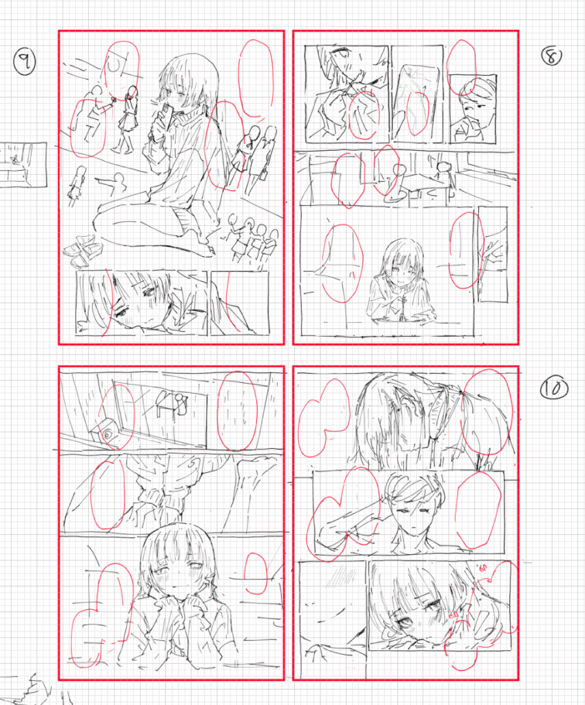 ตอนนี้ก็เขียนเนม (สตอรี่บอร์ด) อยู่นั่นแหละ สี่หน้านี้เป็นหน้าที่แก้เยอะสุด… บก. พยายามให้เล่าเรื่องเน้นอารมณ์ให้มากที่สุด เพื่อที่จะส่งผลต่อส่วนอื่นๆ ของเรื่อง ก็เข้าใจความรู้สึกอยากให้ผลงานดีที่สุดนะ เขาก็สอนอะไรหลายอย่าง แต่แบบ…
