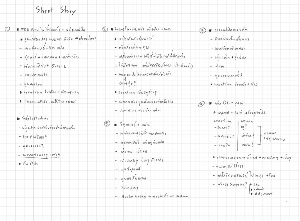 ผมก็ไปนั่งคิดนอนคิดเรื่องมา…สัส คิดไม่ออก 555 ปกติเขียนอะไรยาวๆ ได้ แต่เป็นลักษณะการสะท้อนสิ่งที่ตัวเองคิดหรือเจอเฉยๆ ไม่เคยแต่งเรื่องราวขึ้นใหม่ ไม่เคยออกแบบตัวละคร วาดปกติก็วาดแต่แฟนอาร์ท ก็เลยลองให้ AI คิดไอเดียมา แม่งคิดมาเห่ยมาก… เชยสุดๆ เลยเริ่มไกด์เพิ่มโดยบอกชื่อนักเขียนที่ชอบประกอบ อาทิเช่น ชุนจิ อิวาอิ, โอตสึ อิจิ, โยชิโมโตะ บานาน่า, โอคาดะ มาริ หรือกระทั่งหว่องคาไวกับทาเรนติโน่ ดู ปรากฎว่าไอเดียออกมาดีขึ้น มีธีมมีปม บางอันก็บ้ามาก ก็เซพๆ ไว้ เป็นไอเดีย