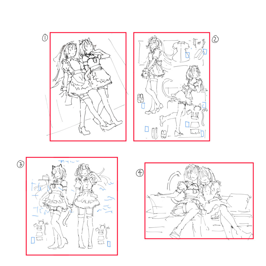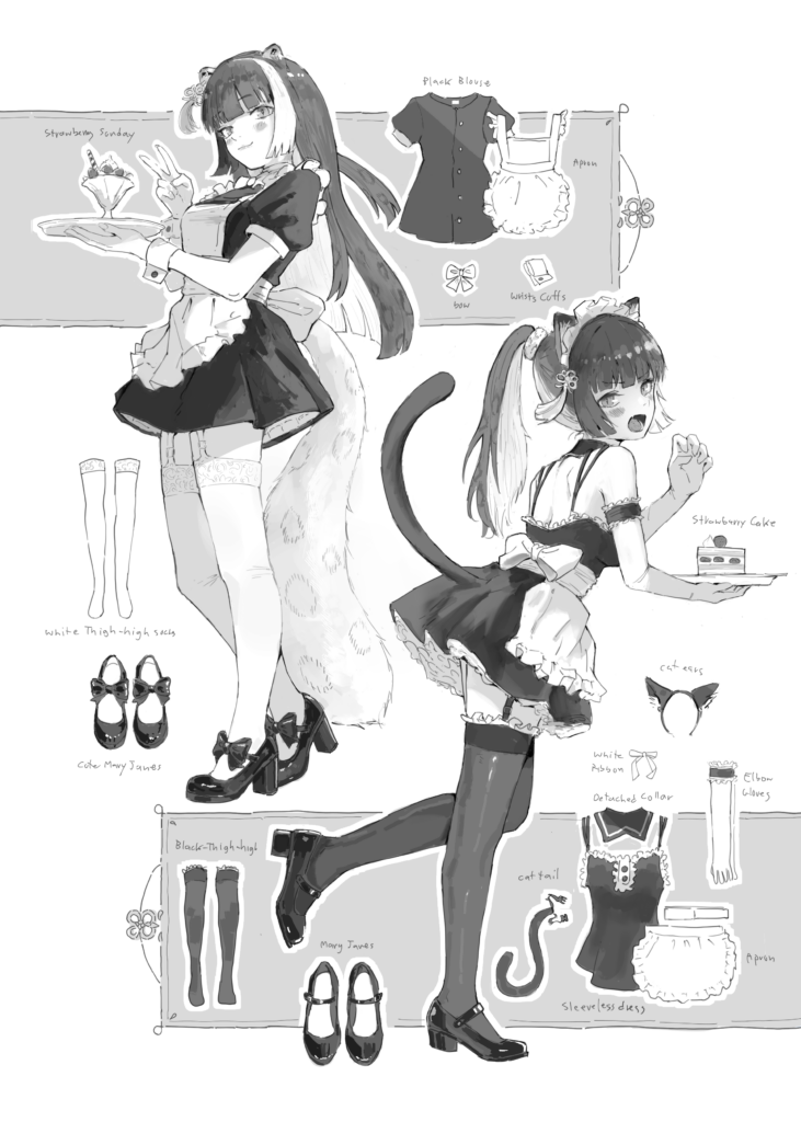 มีคอมมิชชั่นเมดอีกแล้ว คราวนี้ขอแบบสองชุดในภาพเดียว (เพิ่มตัวละคร) ก็ร่างไปให้สี่แบบ เขาเลือกอันนี้ คอนเซ็ปคือภาพจากนิตรยสารแฟชั่น แต่เป็นชุดเมดแทน วาดไปวาดมาน่ารักดี ไม่น่าเชื่อว่าคนจิตใจหยาบช้าแบบผมก็วาดอะไรน่ารักๆ แบบนี้